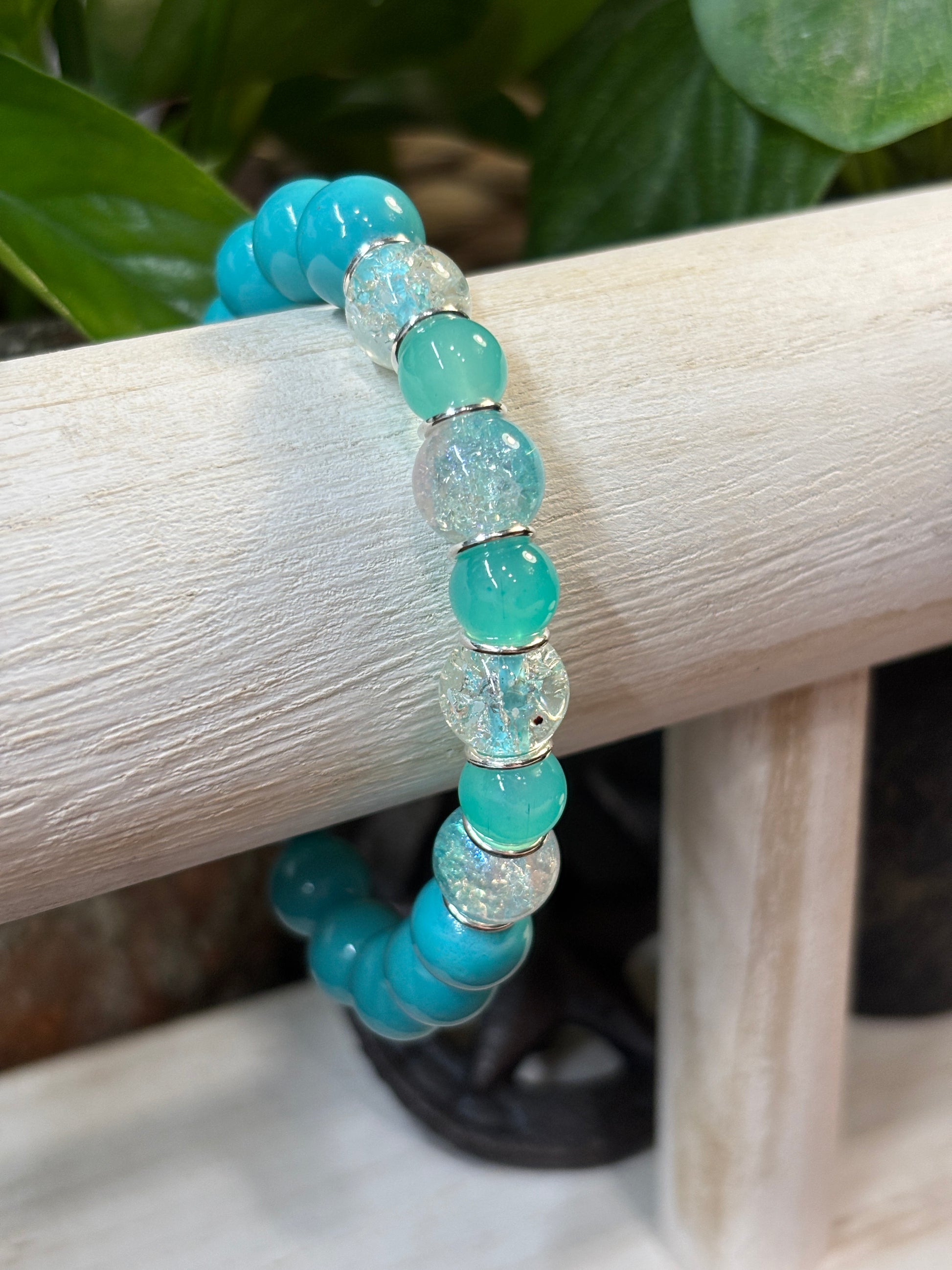 The "Cruise II" Handmade Glass Beaded Stretch Bracelet showcases a captivating mix of bluish cyan and teal beads, enhanced by clear crackle glass and delicate silver colored spacers. This beautifully crafted bracelet offers a comfortable stretch fit, making it an effortless way to add a splash of color and refined charm to your everyday look or special occasions. Make a statement with this unique accessory that blends artistry and style seamlessly.