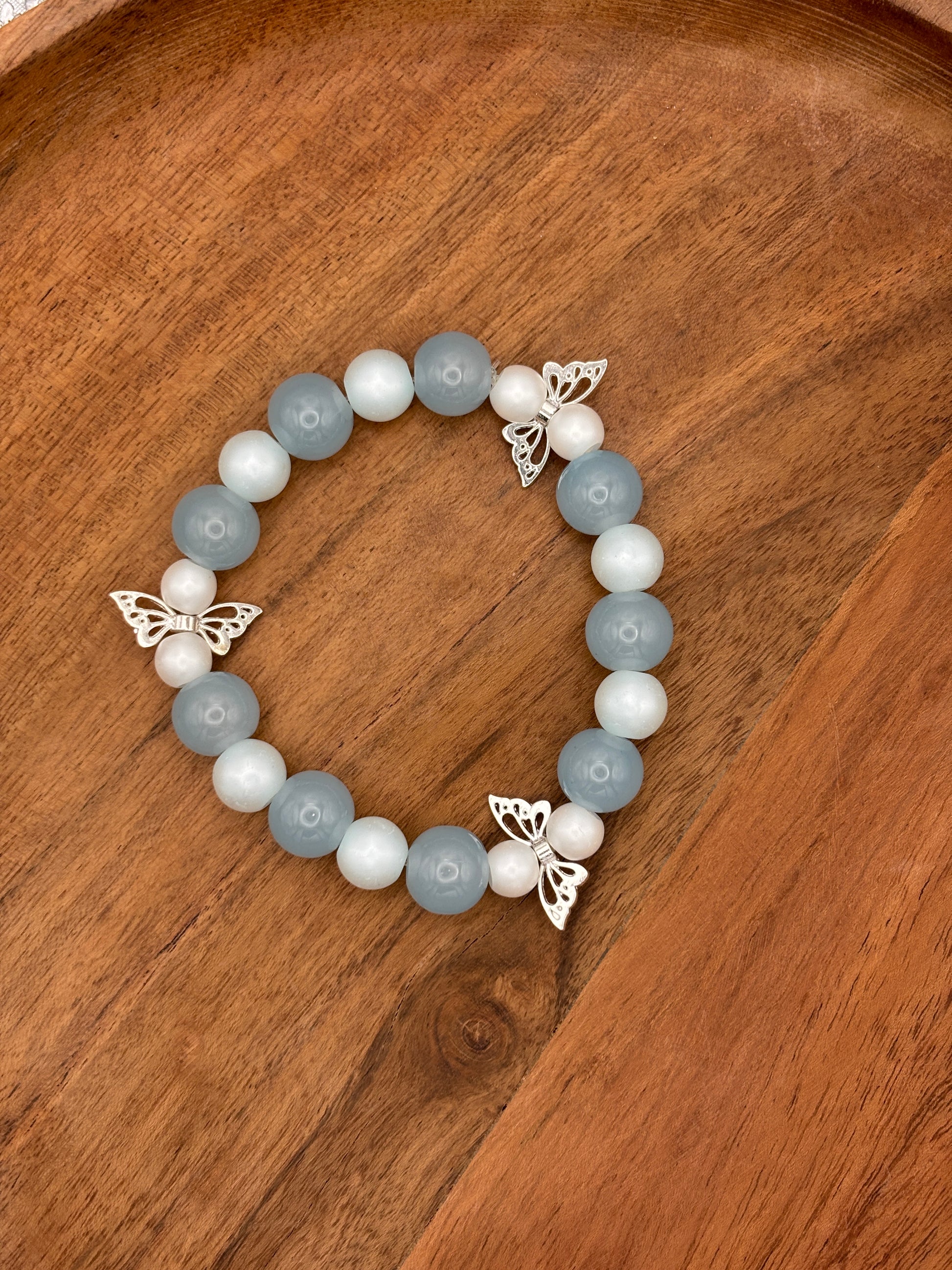 Introducing our Flutter bracelet, a delicate and charming accessory that captures the essence of a butterfly's gentle flight. This handcrafted bracelet features a mesmerizing blue hue that shimmers and shines, evoking the image of a butterfly's wings. It's the perfect piece for those who love to add a touch of elegance and whimsy to their outfit.
